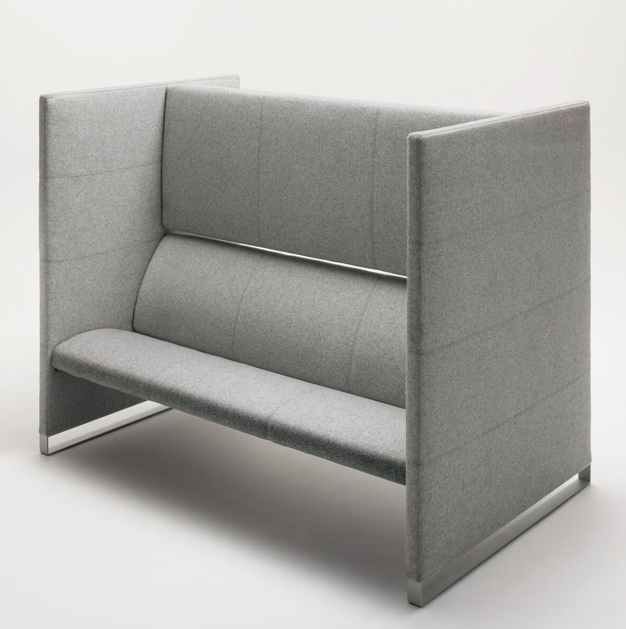 Die Kombination von zwei Hochlehner-Sofas mit einer verbindenden Trennwand schafft einen abgeschirmten, ruhigen Bereich, der akustisch vom Umfeld isoliert ist – perfekt für konzentriertes Arbeiten oder vertrauliche Besprechungen.